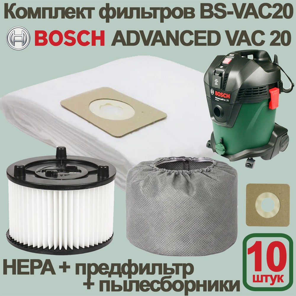 BS-VAC20/10 Комплект мешков-пылесборников (10 шт), HEPA-фильтра и предфильтра для пылесоса BOSCH ADVANSED VAC 20, BOSCH UNIVERSAL VAC 15